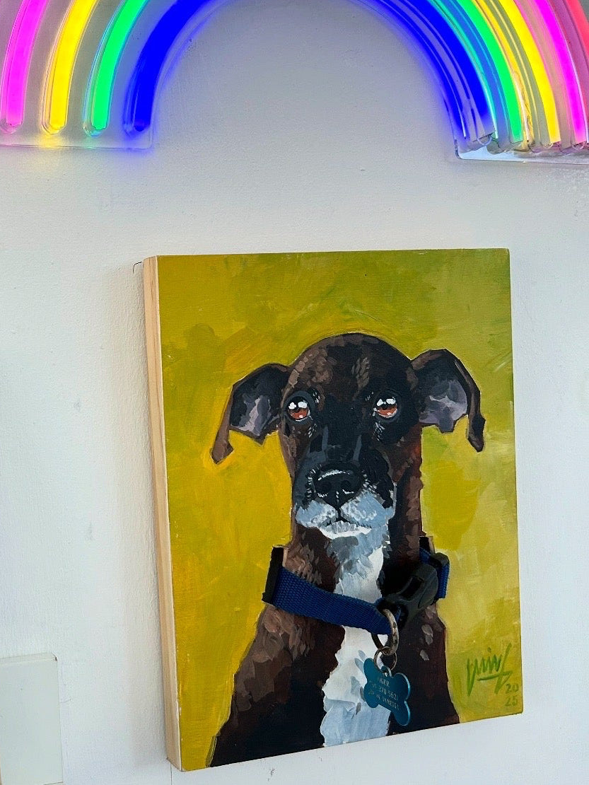 Ilustración personalizada en acrílico sobre madera 8x10 con collar (no incluye tag con nombre). Una mascota por ilustración. Foto debe ser de frente para mejor referencia.